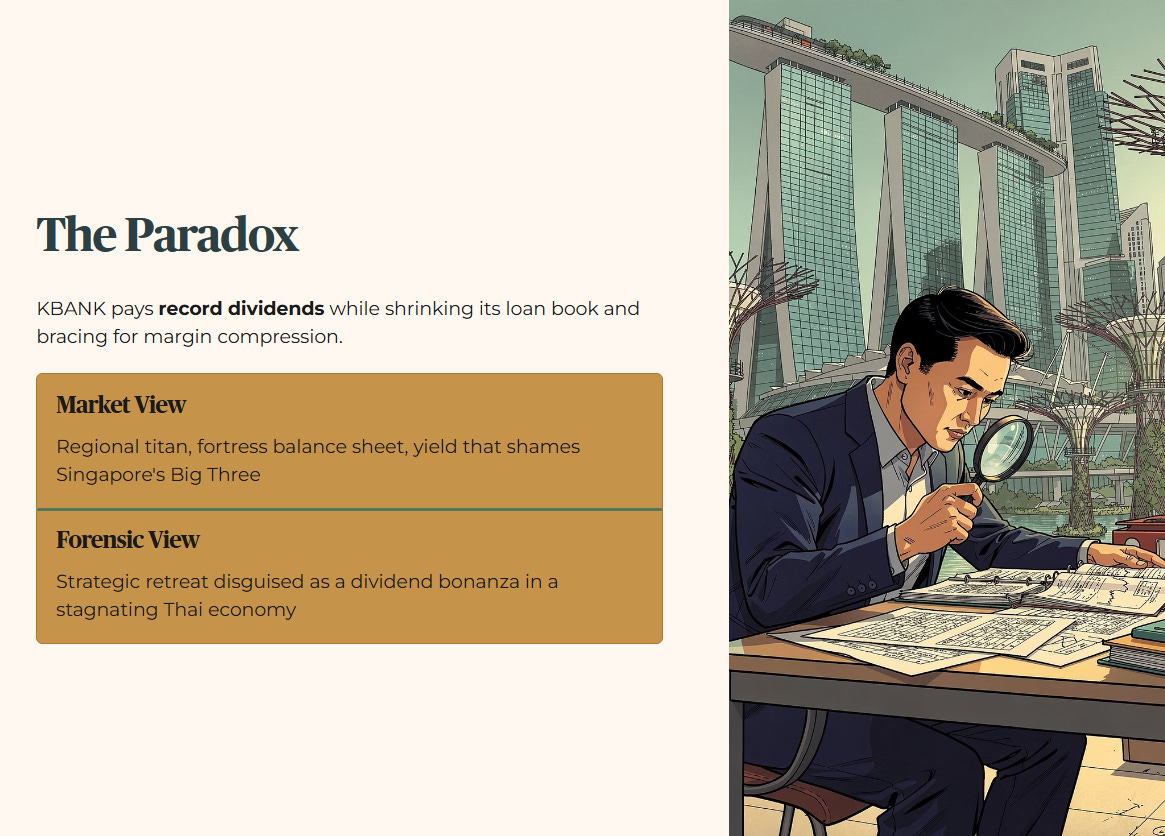 The market sees a regional banking titan with a fortress balance sheet and a dividend yield that makes Singapore’s “Big Three” look like conservative savings accounts. Yet, the forensic data reveals a paradox: KBANK is paying out record dividends while simultaneously shrinking its loan book and bracing for a structural compression in its core profit engine. It is the classic “Skeptical Arbitrator” dilemma. Is this a high-yield recovery play or a beautifully wrapped trap set within a stagnating Thai economy?