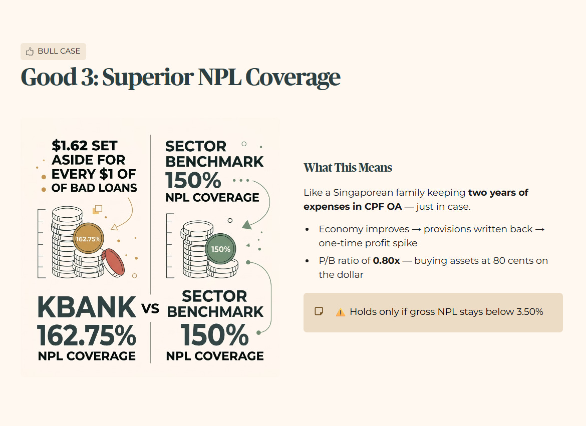 So what does this mean for you? If refinancing becomes difficult for Thai families, NPLs won’t just stay at 3.20%; they will spike. If NPLs rise by just 10% (to roughly THB 103 billion), the bank would need to find THB 15 billion in new provisions. This would wipe out 30% of your annual earnings and likely force a dividend cut. For a Singaporean portfolio, this represents a major concentration risk. If you already own SG banks, adding KBANK triples your exposure to “Asian Consumer Debt.”