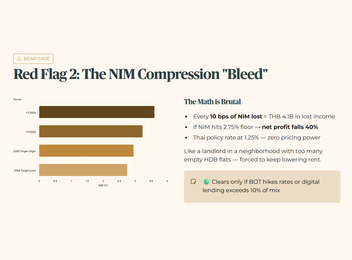 In the banking world, 48 basis points is not a “trim”; it’s a “haircut.” For every 10 bps of NIM lost, interest income drops by THB 4.1 billion. If the bank hits the bottom of their target (2.75%), net profit could fall by 40%. And let’s be honest, they are not wrong to be worried. With the Thai policy rate at 1.25%, the bank has no “pricing power.” They are like a landlord in a neighborhood with too many empty HDB flats—they have to keep lowering the rent just to keep the tenants.