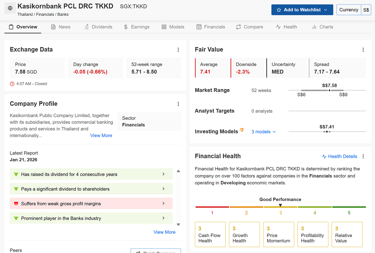 Kasikornbank PCL (SGX:TKKD): 3 Good & 3 Red Flags