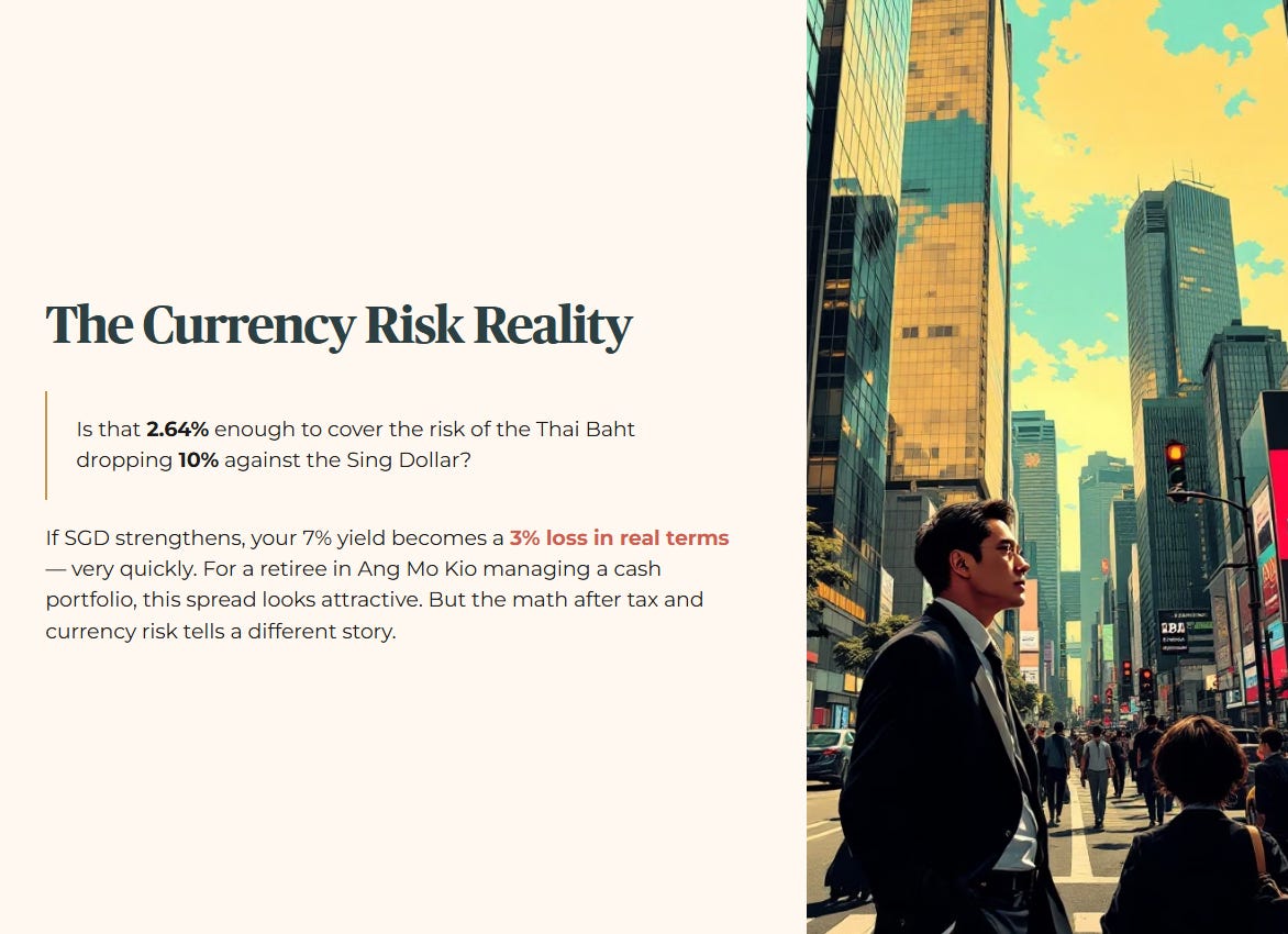 Is that 2.64% enough to cover the risk of the Thai Baht dropping 10% against the Sing Dollar? Probably not. If the SGD strengthens, your 7% yield becomes a 3% loss in real terms very quickly.
