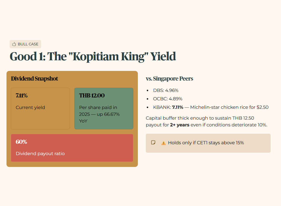 Compared to Singapore peers like DBS (4.96%) or OCBC (4.89%), KBANK offers a massive premium. For a Singaporean investor, this is like finding a hawker stall selling Michelin-star chicken rice for $2.50—it feels too good to be true, but the math checks out because the bank’s Dividend Payout Ratio has climbed to 60.0%. If conditions improve by 10% and fee income accelerates, we could see the yield touch 8%. If they deteriorate 10%, the bank’s capital buffer is so thick it could likely maintain the current THB 12.50 payout for at least two years without sweating.
