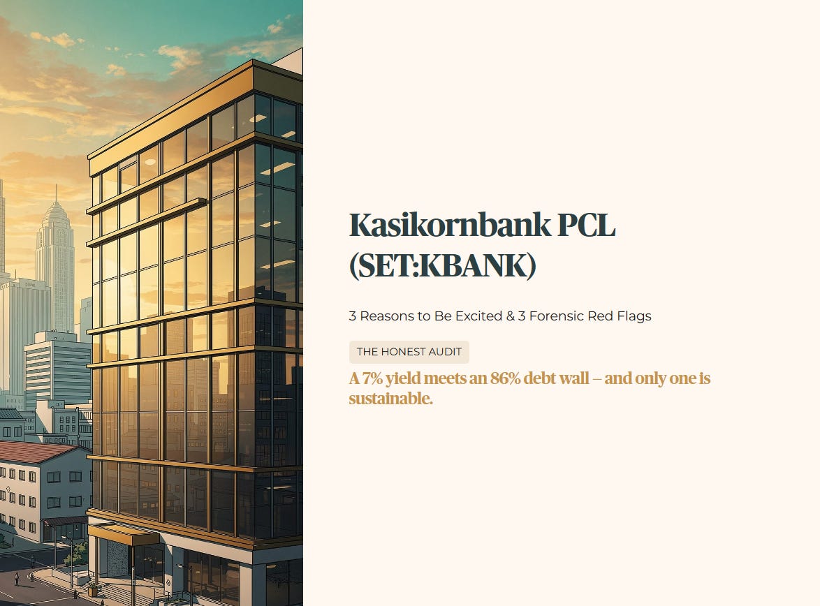 You are reading a forensic audit shared with 190 private members of the Iggy community. Today, we cover Kasikornbank (KBANK) — Thailand’s second-largest bank by assets, and one of the few Thai stocks accessible to Singapore investors via SGX as a Singapore Depositary Receipt (SDR: SGX:TKKD). We don’t look at the glossy annual report covers; we look at the debt maturity schedules and the yield spreads that the mainstream media ignores.