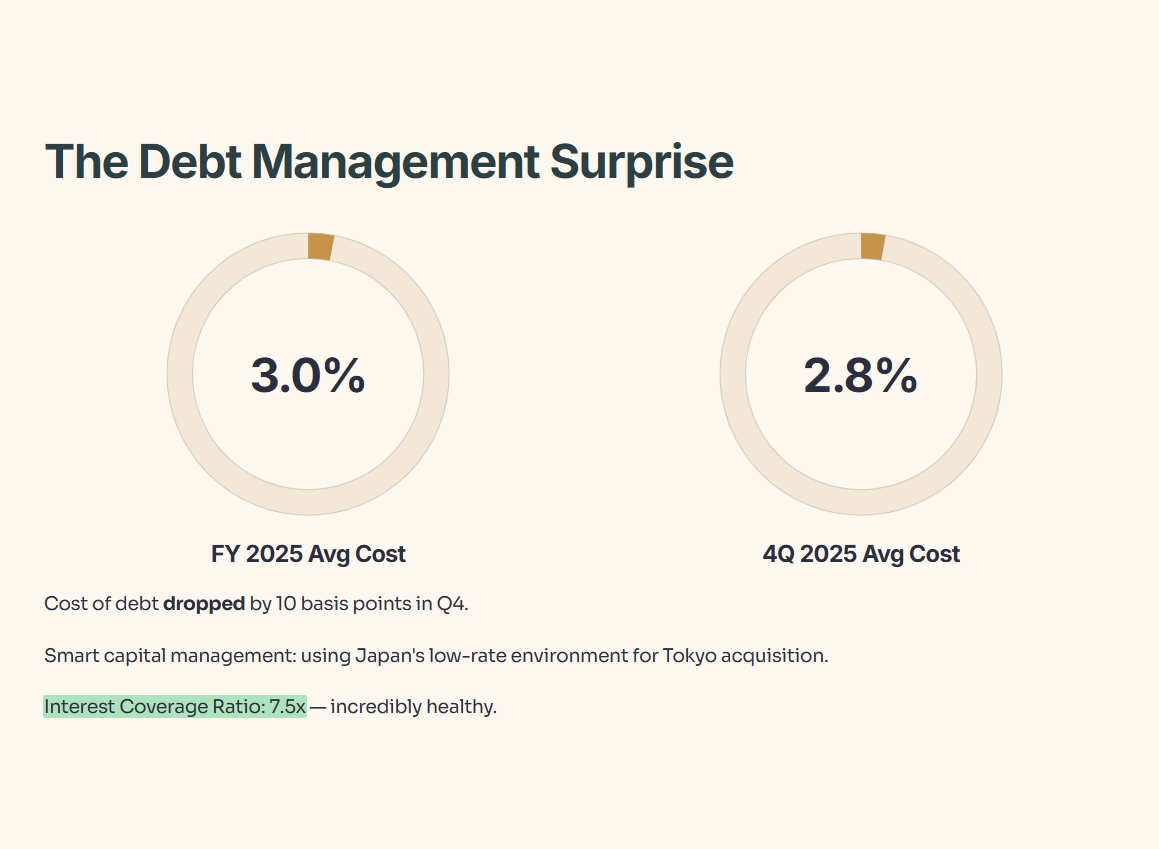 They managed to lower their interest costs by 10 basis points in the last quarter largely due to drawing down cheaper Japanese Yen (JPY) debt for the Tokyo acquisition. This is smart capital management—using Japan’s low-rate environment to hedge against higher global rates.