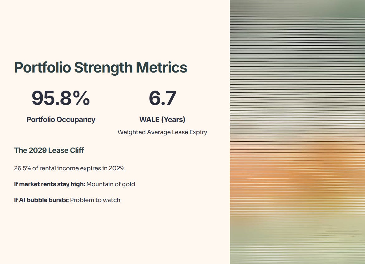 The Risk to Watch: Look at the expiry profile on Slide 15. In 2029, 26.5% of their rental income expires. That is a “lease cliff.” However, if market rents stay this high, that cliff turns into a mountain of gold. If the AI bubble bursts by 2029, it becomes a problem.