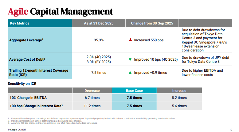 While 35.3% is higher than the super-conservative 29-30% we saw previously, it is still well within the safety zone (regulatory limit is 50%, internal threshold usually 40%). They cite the debt drawdown was specifically for the Tokyo Data Centre 3 acquisition and the lease extension for Singapore 7 & 8.