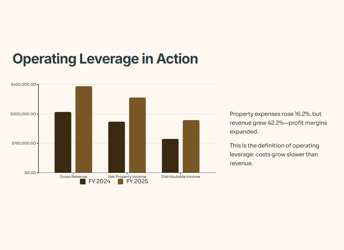 However, we need to respect the “Double-Entry Rule.” You can’t have revenue growth without cost growth. Property Expenses rose 16.2%, but since revenue grew much faster (42.2%), the profit margins actually expanded. That is the definition of operating leverage.