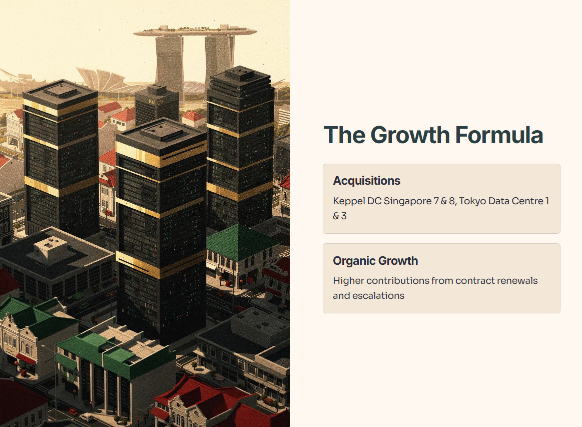 Acquisitions: The numbers were pumped by the purchase of Keppel DC Singapore 7 & 8 and Tokyo Data Centre 1 & 3.