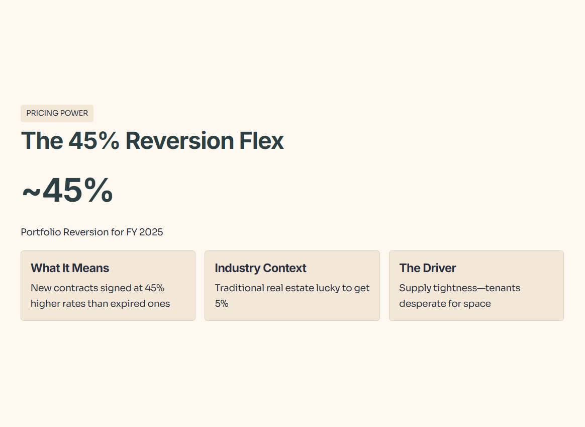 That is the Portfolio Reversion for FY 2025. For the uninitiated, “Positive Reversion” means when an old contract expires, the new contract is signed at a higher rate. A 45% jump is unheard of in traditional real estate like malls or offices (where you’re lucky to get 5%).