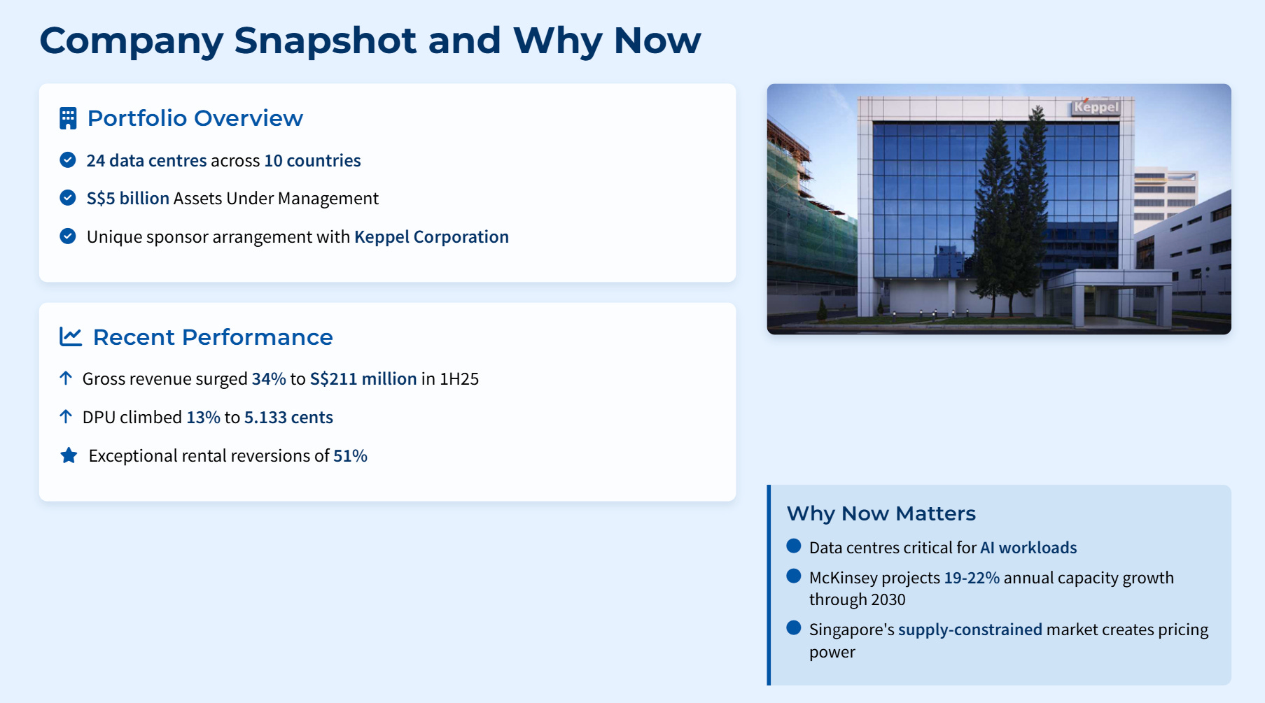 Singapore’s most diversified data centre REIT just posted very strong rental reversions in 1H25, yet smart money should look beyond the headline numbers. The market loves Keppel DC REIT’s story—STI inclusion, a big jump in distributable income, and expansion into AI-ready hyperscale facilities across 10 countries. But strong prints can hide structural risks that hurt later.