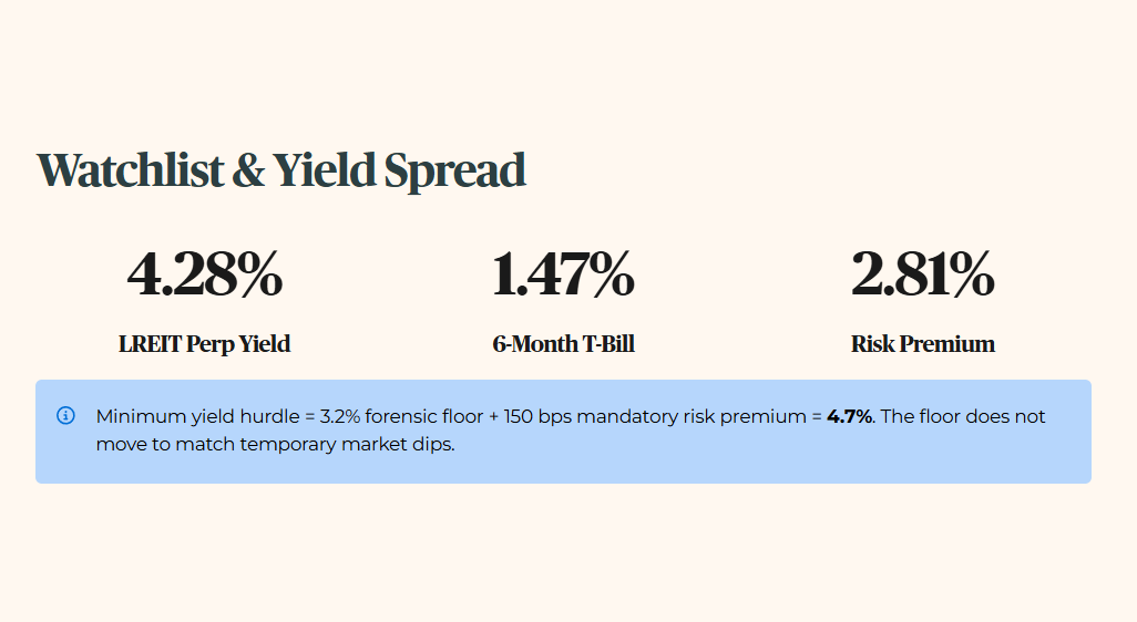 Stress-Test Buffer: For this audit, the conservative 3.2% forensic floor applies. The T-Bill sits at 1.47%, but that floor does not move to match a temporary market dip. The standard is set to ensure sanctuary assets can withstand a return to long-term average interest rates. The minimum yield hurdle remains 4.7%, being the 3.2% floor plus 150 basis points of mandatory risk premium.