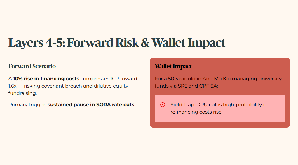 Layer 5 — Wallet Impact: For a 50-year-old in Ang Mo Kio managing children’s university funds through SRS and CPF SA, this counter is a Yield Trap. The yield does not compensate for the gearing risk, and a DPU cut is a high-probability event if refinancing costs continue to rise.
