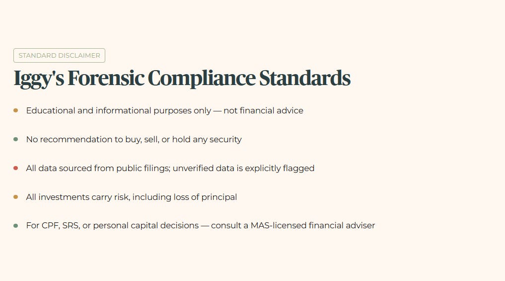 This content is produced for educational and informational purposes only. I am not a financial advisor — I am a retail investor who applies forensic analysis to my own portfolio and shares that process publicly. Nothing here constitutes a recommendation to buy, sell, or hold any security, and no specific target prices or personalised financial advice are offered. All data is sourced from public filings and verified sources; where data is unverified it is explicitly flagged. All investments carry risk, including the potential loss of principal, and past performance is not indicative of future results. If you are making investment decisions involving CPF, SRS, or personal capital, please conduct your own due diligence or consult a MAS-licensed financial adviser before committing funds.