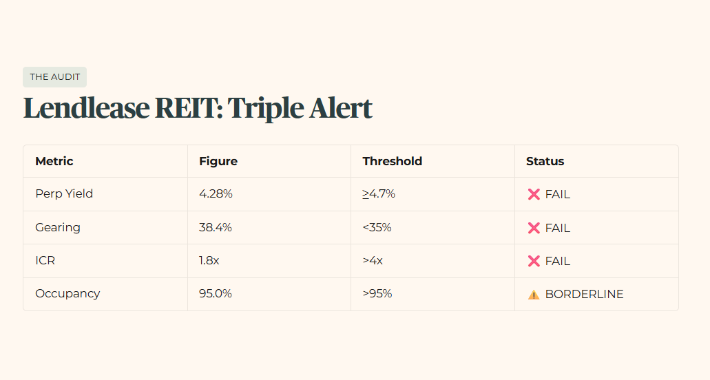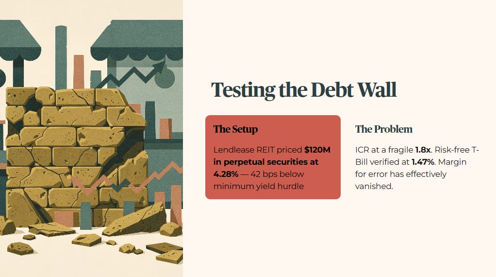Lendlease Global Commercial REIT has priced $120 million in perpetual securities at 4.28%, a figure that sits 42 basis points below my minimum yield hurdle while tethered to a fragile 1.8x interest coverage ratio. With the risk-free T-Bill now verified at 1.47%, the margin for error for high-gearing retail landlords has effectively vanished. Here is the forensic data on why these numbers represent a watchlist trigger rather than a sanctuary.