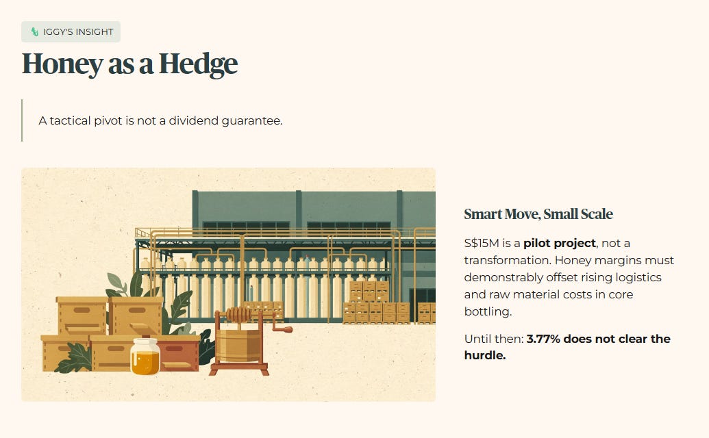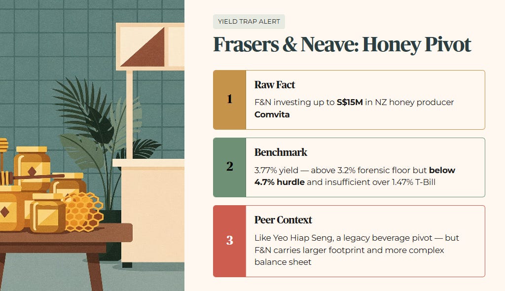 F&N’s Comvita move is a classic capital rotation play. They are moving away from mass-market sugar and toward premium health. But at S$15 million, this is a pilot project, not a transformation. For this to change the forensic stance, F&N needs to demonstrate that honey margins can offset rising logistics and raw material costs in their core bottling business. Until then, the 3.77% yield is not enough to clear the hurdle. A tactical pivot is not a dividend guarantee.