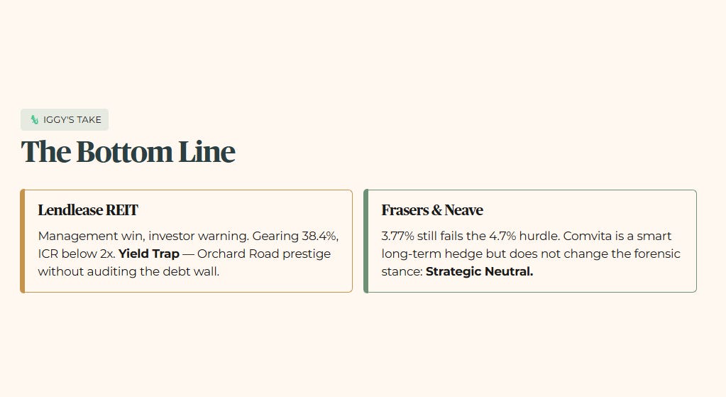 Lendlease Global Commercial REIT: The pricing of the new perps is a management win but an investor warning. With gearing at 38.4% and an ICR below 2x, the safety margin has evaporated. It remains a Yield Trap for those chasing Orchard Road prestige without auditing the debt wall.