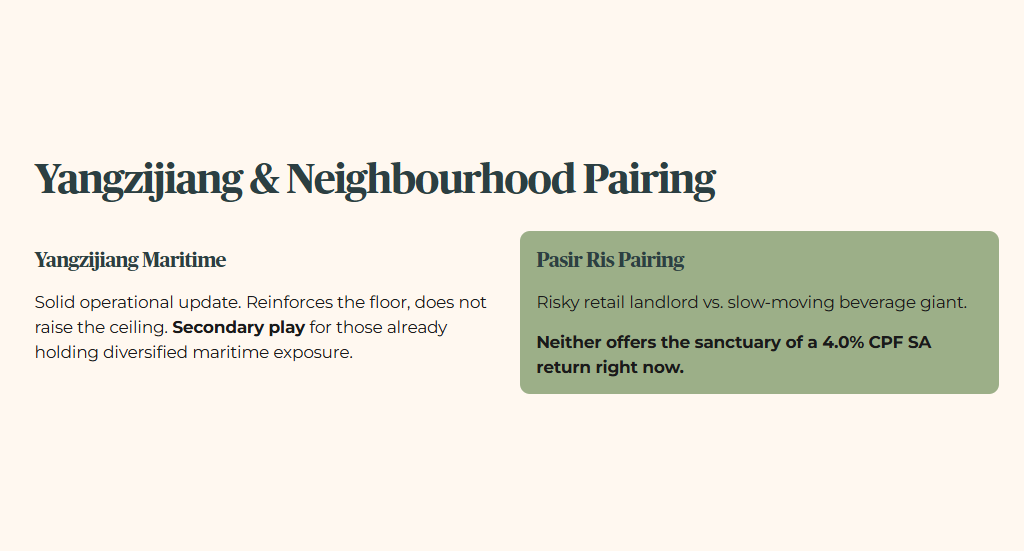 Neighbourhood Pairing: For the resident in Pasir Ris looking at these three counters, the choice is between a risky retail landlord and a slow-moving beverage giant. Neither offers the sanctuary of a 4.0% CPF SA return right now.