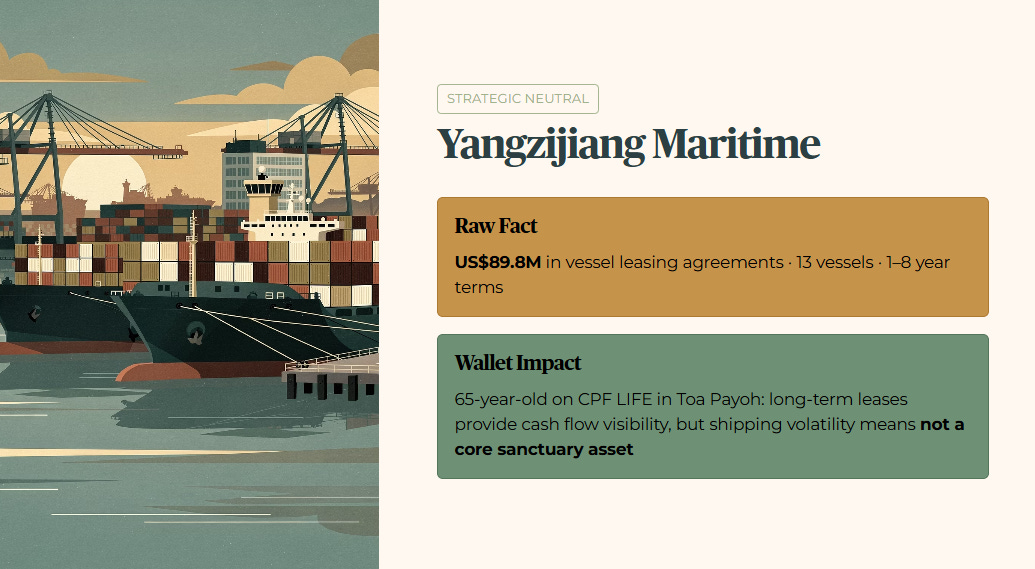 Wallet Impact: For a 65-year-old drawing CPF LIFE in Toa Payoh, this is a Strategic Neutral. The long-term leases provide cash flow visibility, but the shipping sector’s inherent volatility means this is not a core sanctuary asset for a retirement drawdown.