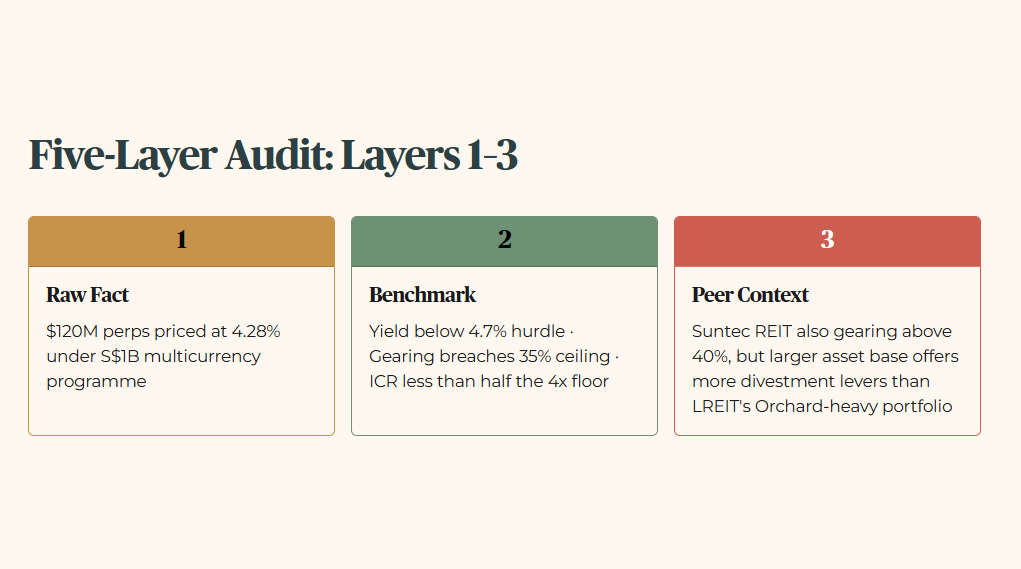 Layer 1 — Raw Fact: Lendlease Global Commercial REIT priced $120 million in perpetual securities at a 4.28% coupon under its S$1 billion multicurrency debt issuance programme.