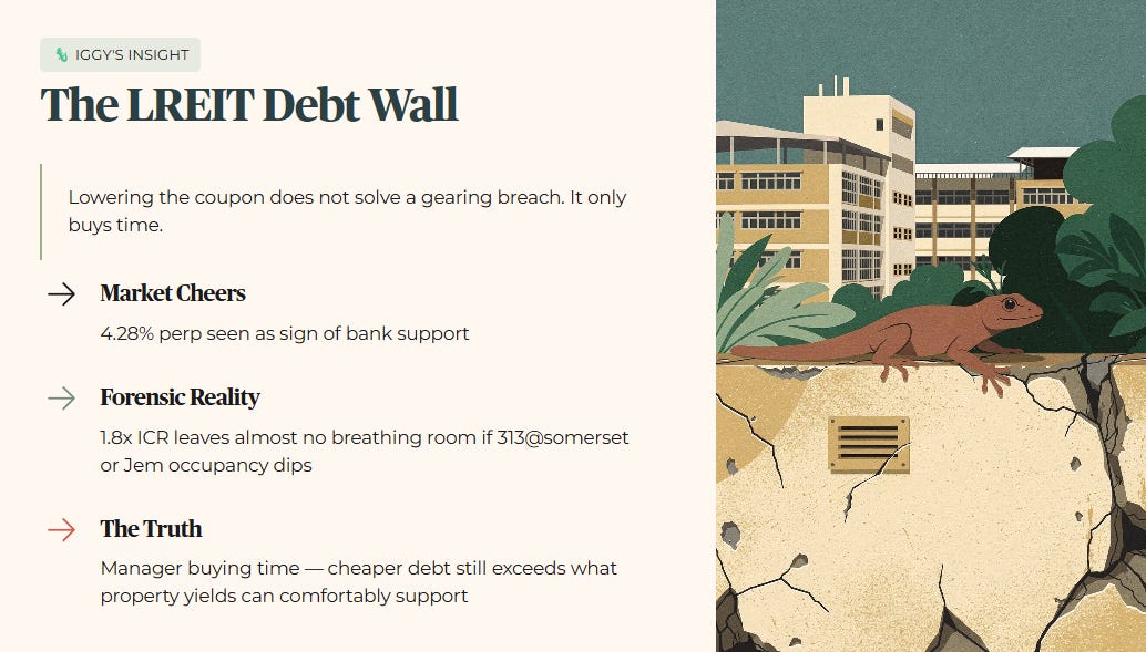 The market is cheering the 4.28% perp pricing as a sign of bank support, but the forensic reality is grimmer. An ICR of 1.8x means the REIT has very little breathing room. If occupancy at 313@somerset or Jem dips even slightly, the math for the distribution starts to break. We are seeing a manager trying to fix a balance sheet by issuing debt that is cheaper than previous tranches but still more expensive than the underlying property yields can comfortably support. Lowering the coupon does not solve a gearing breach. It only buys time.