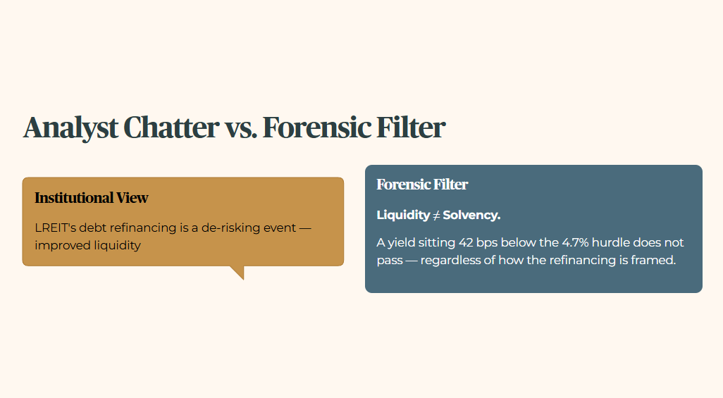 Several institutional houses have highlighted LREIT’s successful debt refinancing as a de-risking event, with the focus falling on improved liquidity. The forensic filter reads this differently. Liquidity and solvency are not the same test, and a yield sitting 42 basis points below the 4.7% hurdle does not pass on yield standards regardless of how the refinancing is framed.
