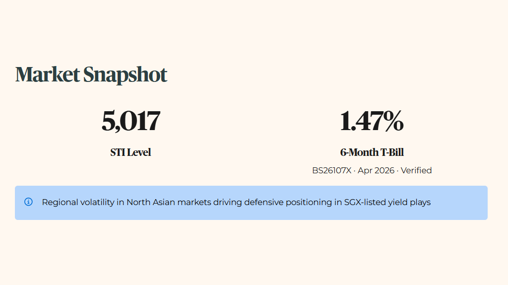 STI Level: 5,016.66 6-Month T-Bill: 1.47% (BS26107X, April 2026 Auction). Verified. Regional Context: Volatility in North Asian markets continues to drive defensive positioning in SGX-listed yield plays.