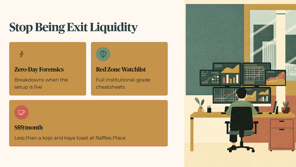 For S$9/month — less than a kopi and kaya toast set at Raffles Place — you stop being the Exit Liquidity and start being the Analyst.