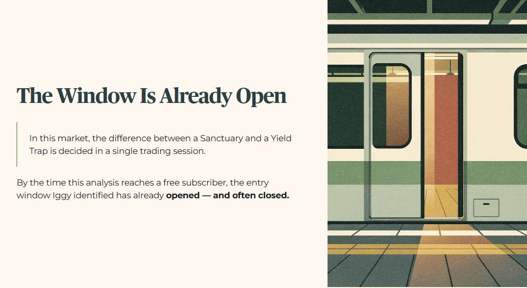 The Window Closes Fast. In this market, the difference between a “Sanctuary” and a “Yield Trap” is decided in a single trading session. By the time this analysis reaches you as a free subscriber, the entry window Iggy identified has already opened — and often closed.
