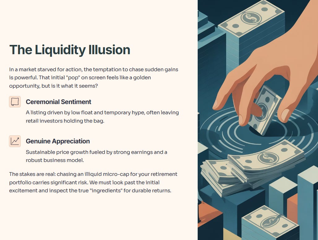 In a market starved for action, it is tempting to chase the only thing moving. You see green on the screen, and you want to be part of it. But here is the problem, and I need you to listen closely. A listing pop driven by a low number of available shares is very different from real price growth driven by solid earnings.