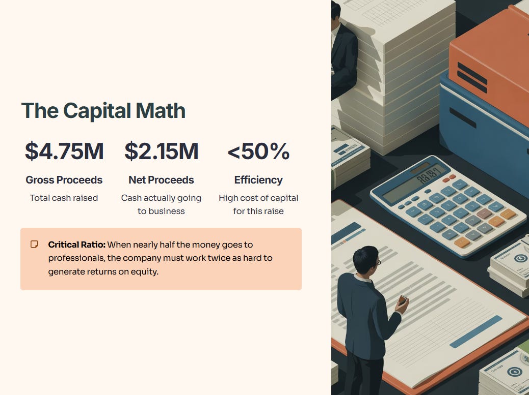 This is a critical ratio. When nearly half the money raised goes to paying the professionals (sponsors, lawyers, placement agents), the company has to work twice as hard to generate a return on that equity.