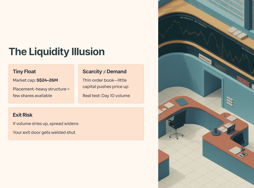 The stock opened at S$0.245, a premium to its S$0.23 offer. Why? Because the float is tiny. With a post-IPO market cap estimated around S$24–26 million and a placement-heavy structure, there simply aren’t many shares floating around for retail traders on Day 1.