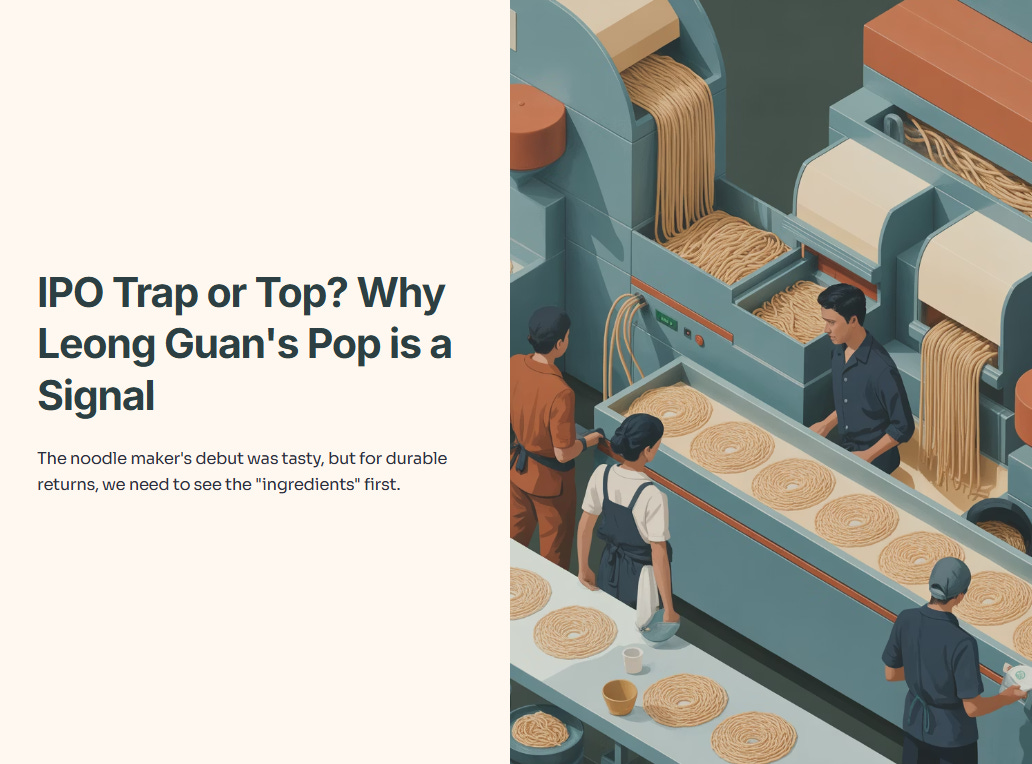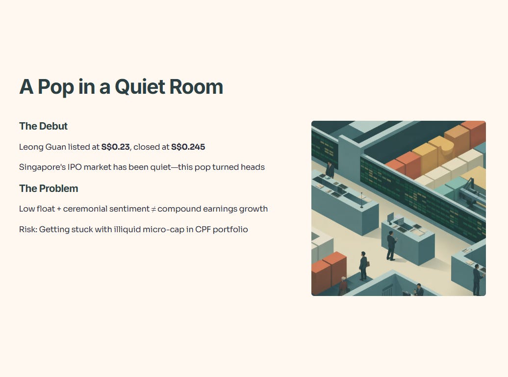 Singapore’s IPO market has been quieter than a library on a Sunday morning, so when Leong Guan (SGX: Catalist) lists and immediately pops above its offer price, heads turn. The noodle manufacturer listed at S$0.23 and closed its debut day higher at roughly S$0.245.