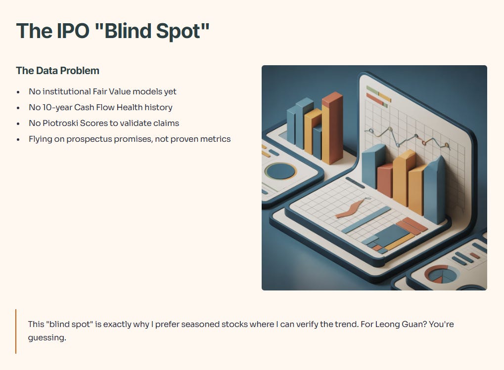 Iggy’s Insight: This “blind spot” is exactly why I prefer seasoned stocks where I can verify the trend. For the rest of your portfolio (your DBS, your Genting, your REITs), you should be checking the Health Scores to ensure you aren’t holding a value trap. But for Leong Guan? You’re guessing.