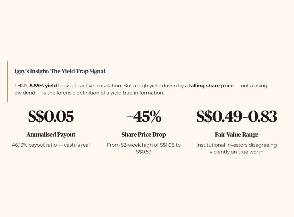 Iggy’s Insight LHN’s 8.55% yield looks attractive in isolation. But a high yield driven by a falling share price — not by a rising dividend — is the forensic definition of a yield trap in formation. The annualised payout is S$0.05, with a 46.13% payout ratio. The cash is real. But the share price has declined from a 52-week high of S$1.08 to S$0.59 — a 45% compression — and the market’s uncertainty band on fair value runs from S$0.49 to S$0.83. That range is the sound of institutional investors disagreeing violently about what this company is actually worth.
