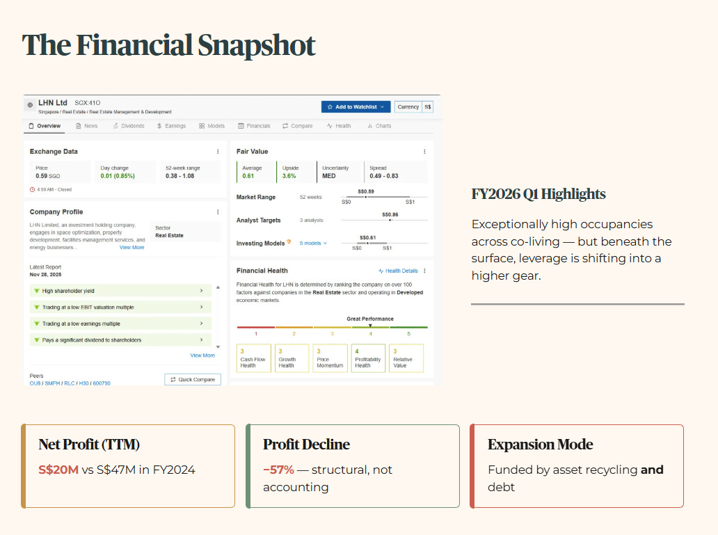 Before we debate the forward-looking narrative, we must anchor ourselves entirely to the raw, verified data. In their FY2026 Q1 update, LHN reported exceptionally high occupancies across their core co-living segments, but beneath the glossy surface, the leverage dynamics are shifting into a higher gear. We are observing an aggressive expansion phase funded by a complex mix of asset recycling and debt. Net profit has declined sharply — from S$47M in FY2024 to S$20M in the trailing twelve months to September 2025, a 57% contraction that the headline occupancy figures do not reveal.