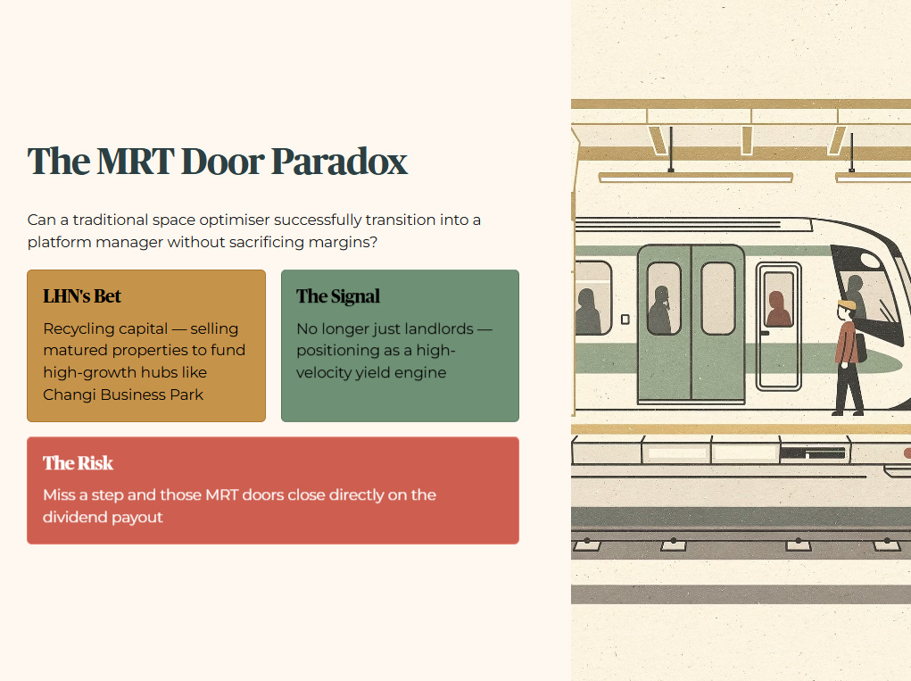 Think of it as the MRT Door Paradox. In Singapore, when the MRT doors are flashing red and closing, you have a split-second decision to make. Do you sprint and risk getting wedged between the heavy doors, or do you stand back, wait for the next train, and accept being late for work? LHN is sprinting. By recycling capital — selling matured properties to fund high-growth hubs like Changi Business Park — management is signalling they are no longer just landlords. They want to be a high-velocity yield engine.