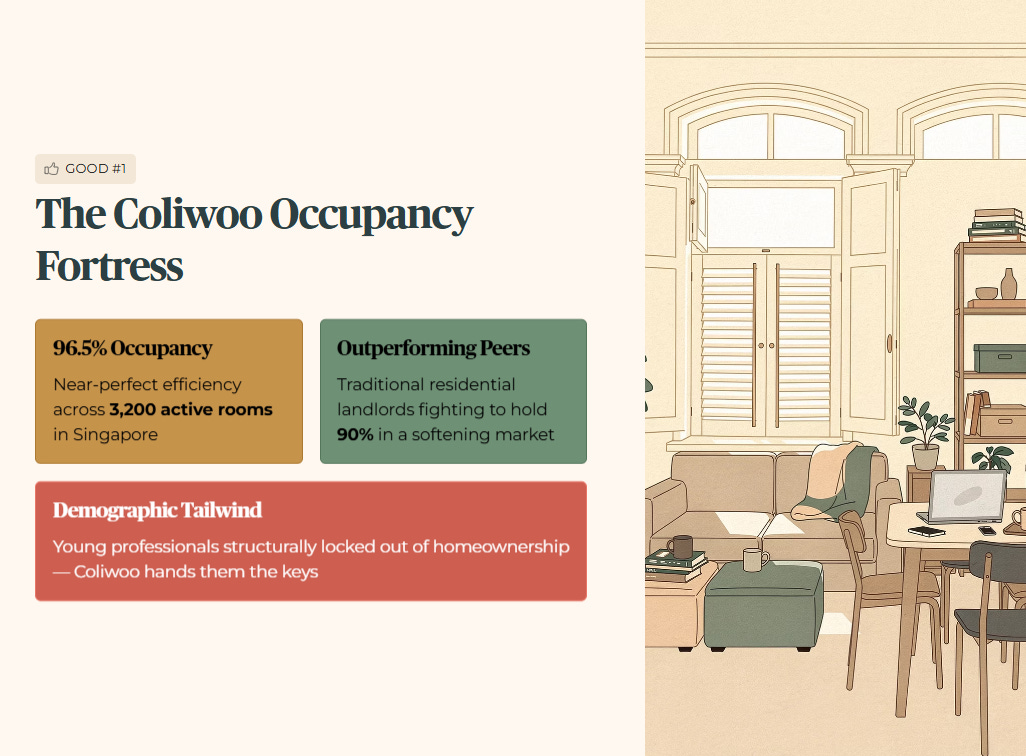 The raw fact is compelling. Coliwoo manages 3,200 active rooms across Singapore, maintaining a 96.5% occupancy rate. Historically, this performance smashes their trailing averages and proves that management can significantly scale their room count without diluting tenant demand. In peer context, traditional residential landlords and private condominium operators are fighting tooth and nail to maintain 90% occupancy amid a softening private rental market. Coliwoo is simply outperforming the traditional alternatives.