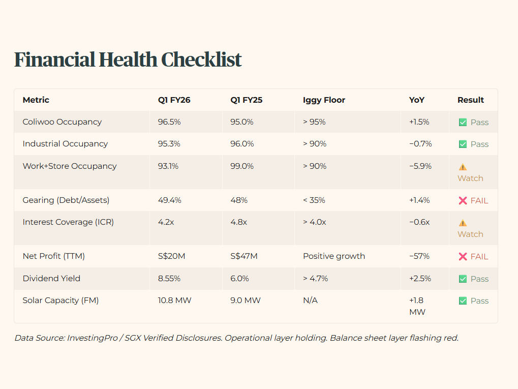The checklist tells a split story. The operational layer — occupancy, ICR, yield — is holding. The balance sheet layer — gearing and profit trajectory — is flashing red. At 49.4% debt-to-assets, LHN is operating well above our forensic ceiling, and the 57% profit decline confirms this is not a temporary accounting artefact. This is structural margin compression playing out in real time.