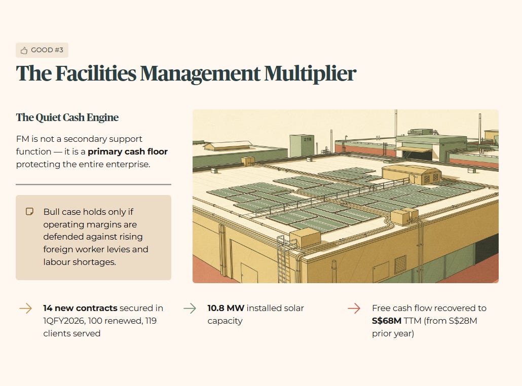 In 1QFY2026, the FM subsidiary secured 14 new contracts and renewed 100 existing ones, serving 119 clients. They reached 10.8 MW of installed solar capacity. Free cash flow for the trailing twelve months to September 2025 came in at S$68M — recovering strongly from S$28M the prior year. This is not a secondary support function. It is a primary cash engine.
