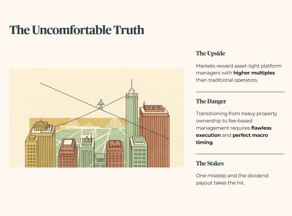 A shrinking yield meets an aggressive asset-light pivot as a traditional landlord attempts a high-wire balancing act.