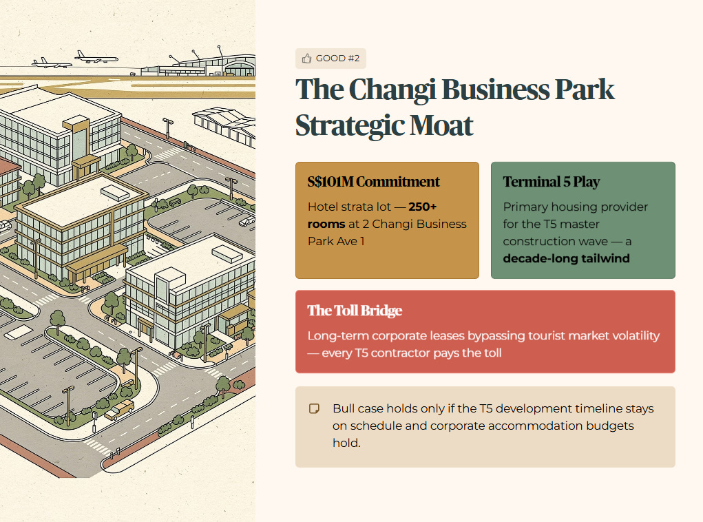 Changi Business Park is rapidly evolving into a self-sustaining economic node — a vital engine room for the eastern corridor. By planting a 250-room flag at its centre, LHN is building a toll bridge. Every major contractor working on T5 will require quality accommodation for their staff. LHN intends to collect that toll.