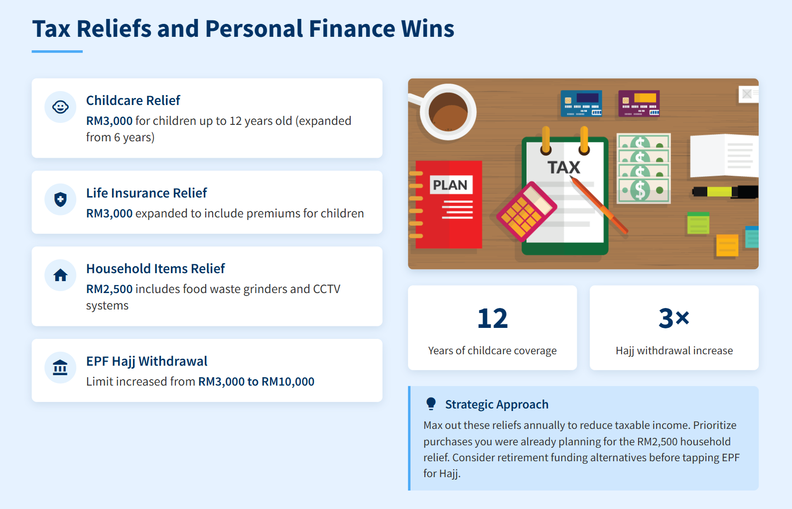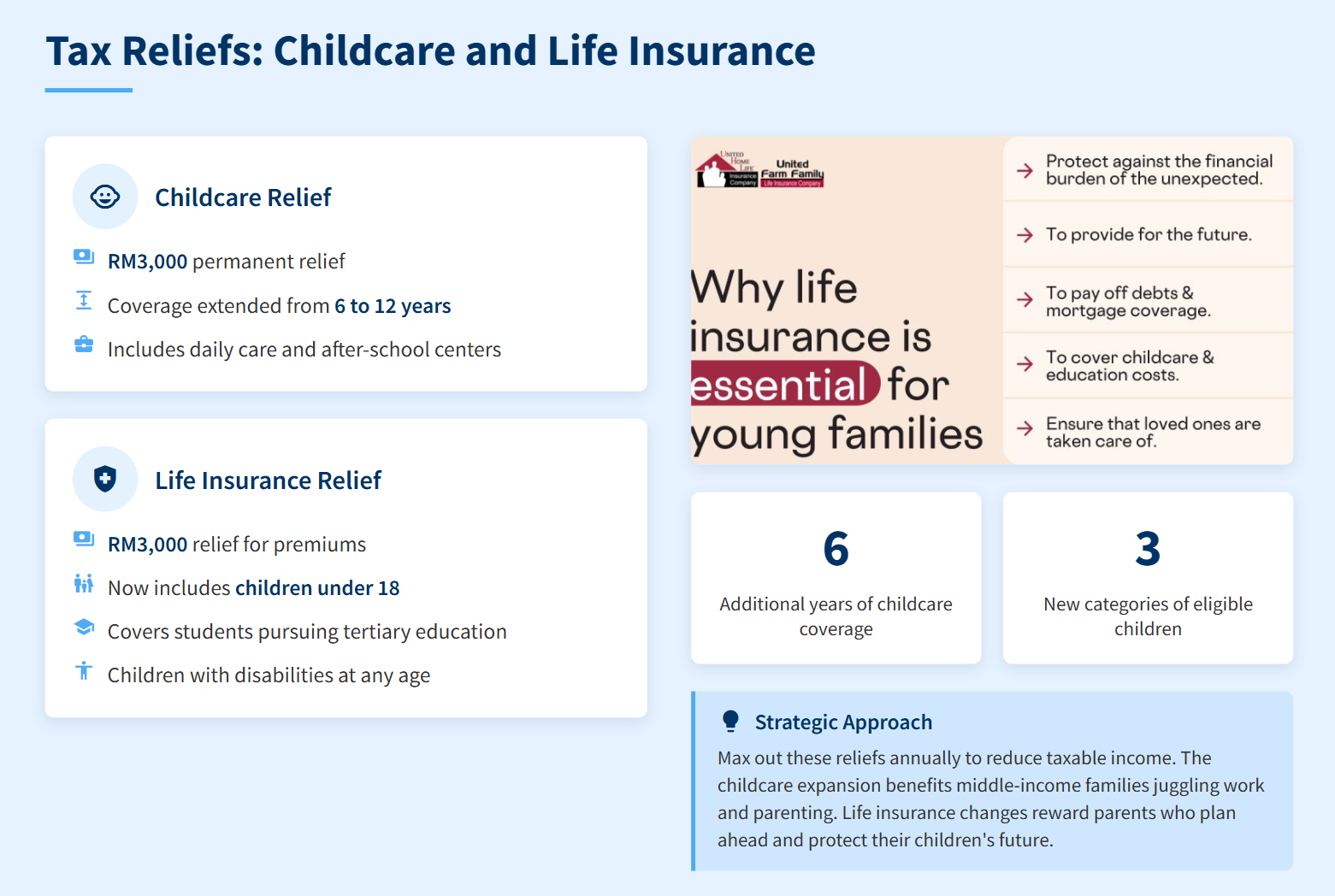 The biggest wins are for middle-income families. The permanent RM3,000 childcare relief is now expanded to cover children up to 12 years old (from six), which is a significant win for working parents. Similarly, the RM3,000 life insurance relief has been expanded to include premiums paid for your children.