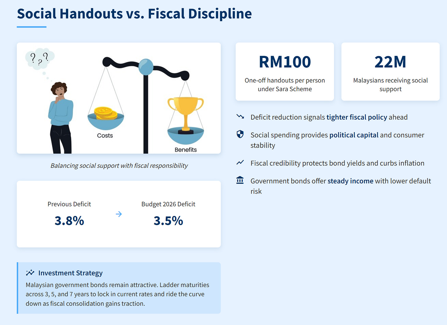 At first glance, the budget seems contradictory. The government is issuing RM100 one-off handouts to 22 million Malaysians under the Sara Scheme while simultaneously tightening its belt to shrink the fiscal deficit from 3.8% to 3.5% of GDP.