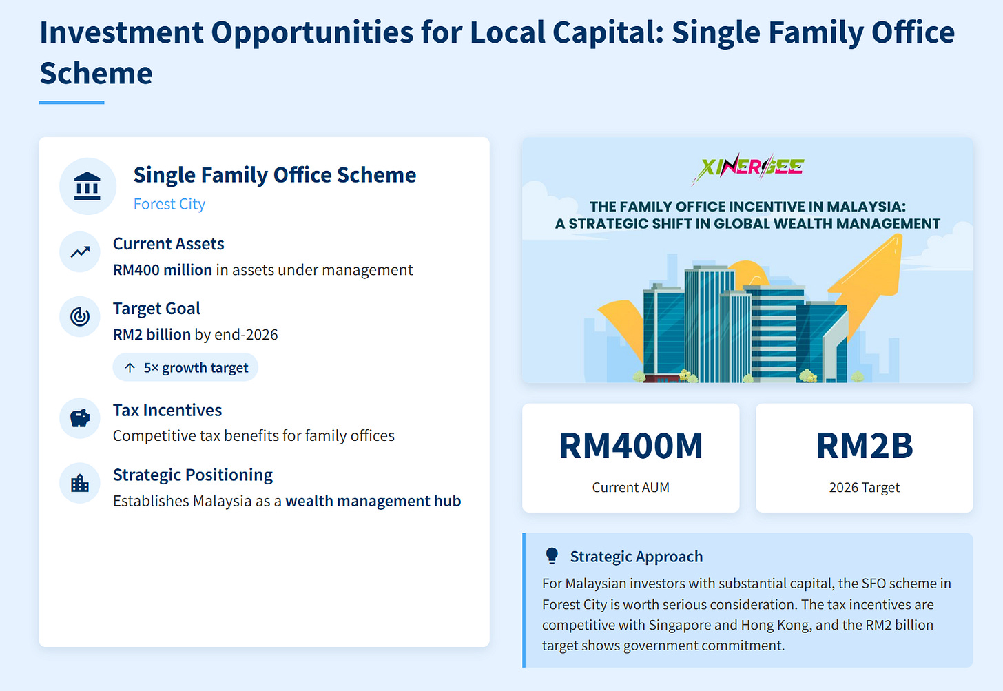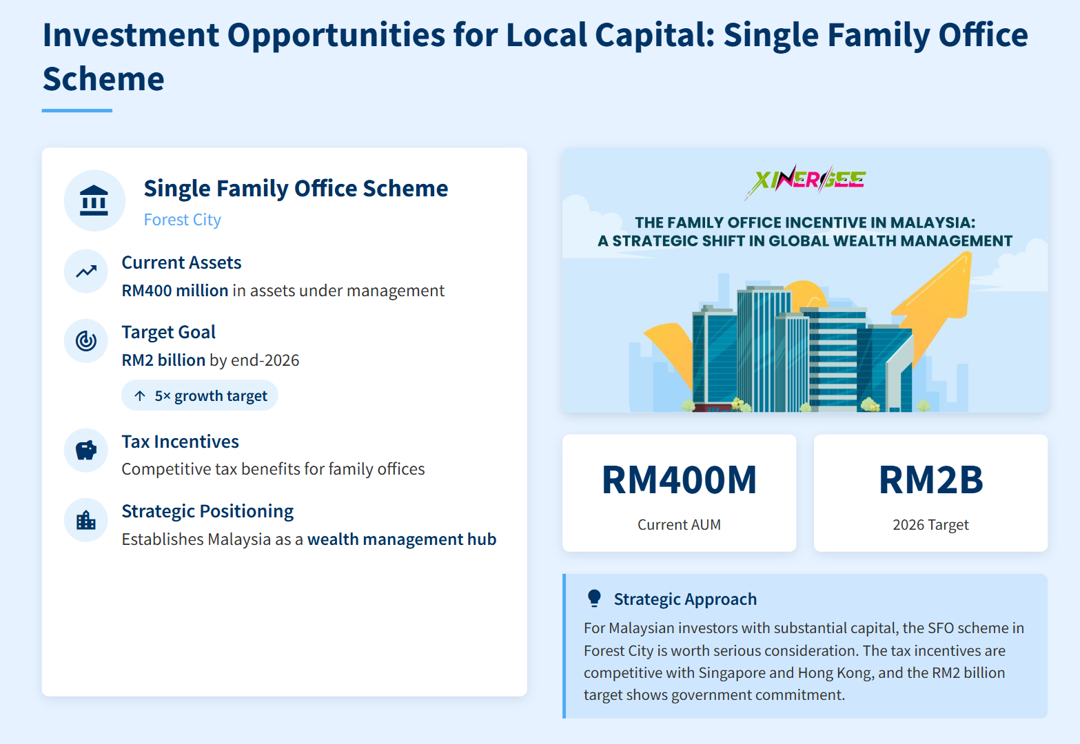 The Single Family Office Incentive Scheme in Forest City has attracted RM400 million in assets under management, with a target of RM2 billion by end-2026. This scheme offers tax incentives for family offices managing wealth in Malaysia, positioning the country as a wealth management hub.