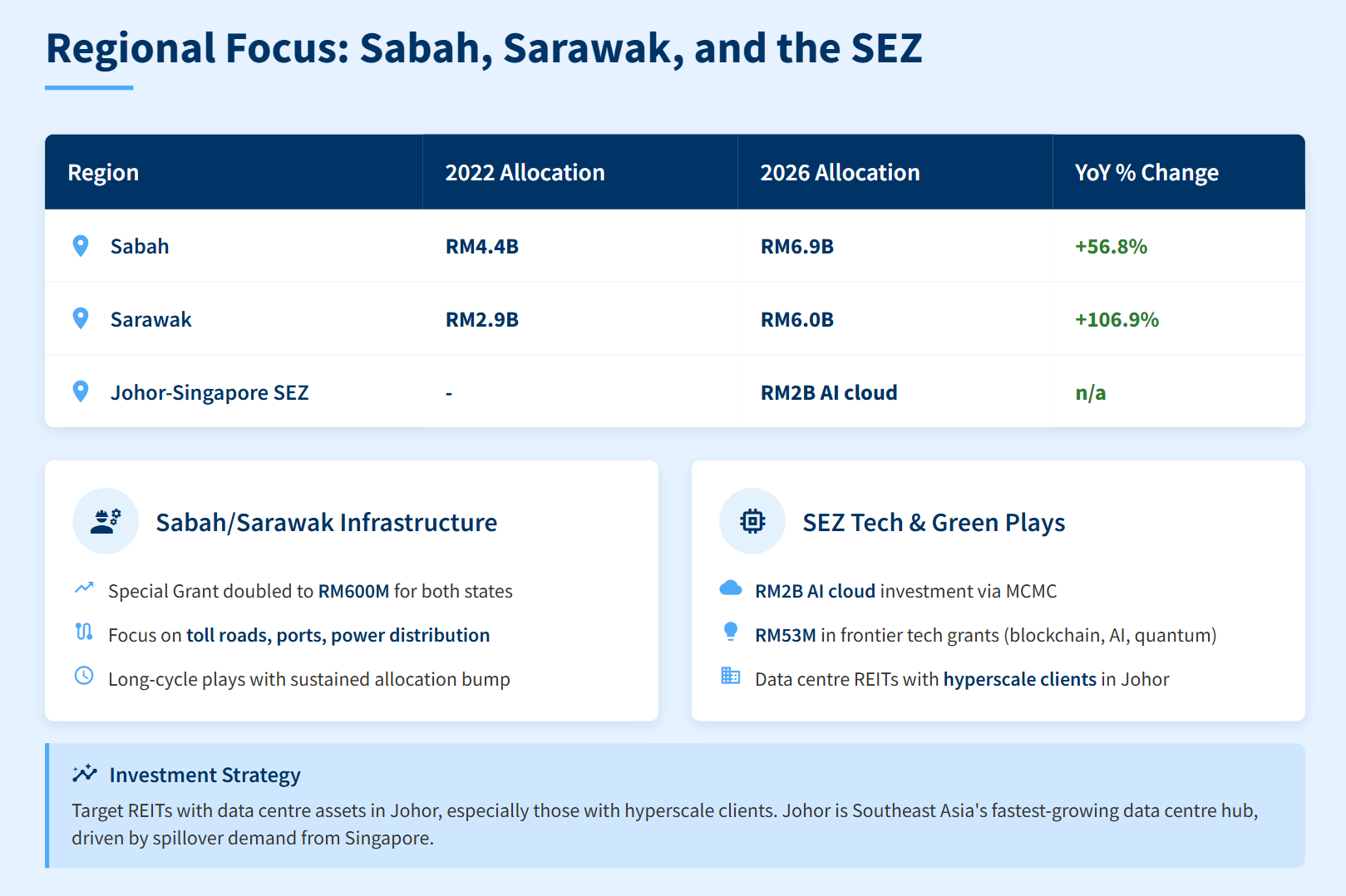 First, the massive infrastructure build-out in Borneo. Allocations for Sabah and Sarawak are jumping to RM6.9 billion and RM6.0 billion respectively—a huge increase from 2022 levels. This fresh federal outlay is real, sustained, and points to a long-cycle opportunity for early movers in utilities, logistics, ports, and power distribution in those states. This is a play for patient capital in infrastructure funds exposed to the region.