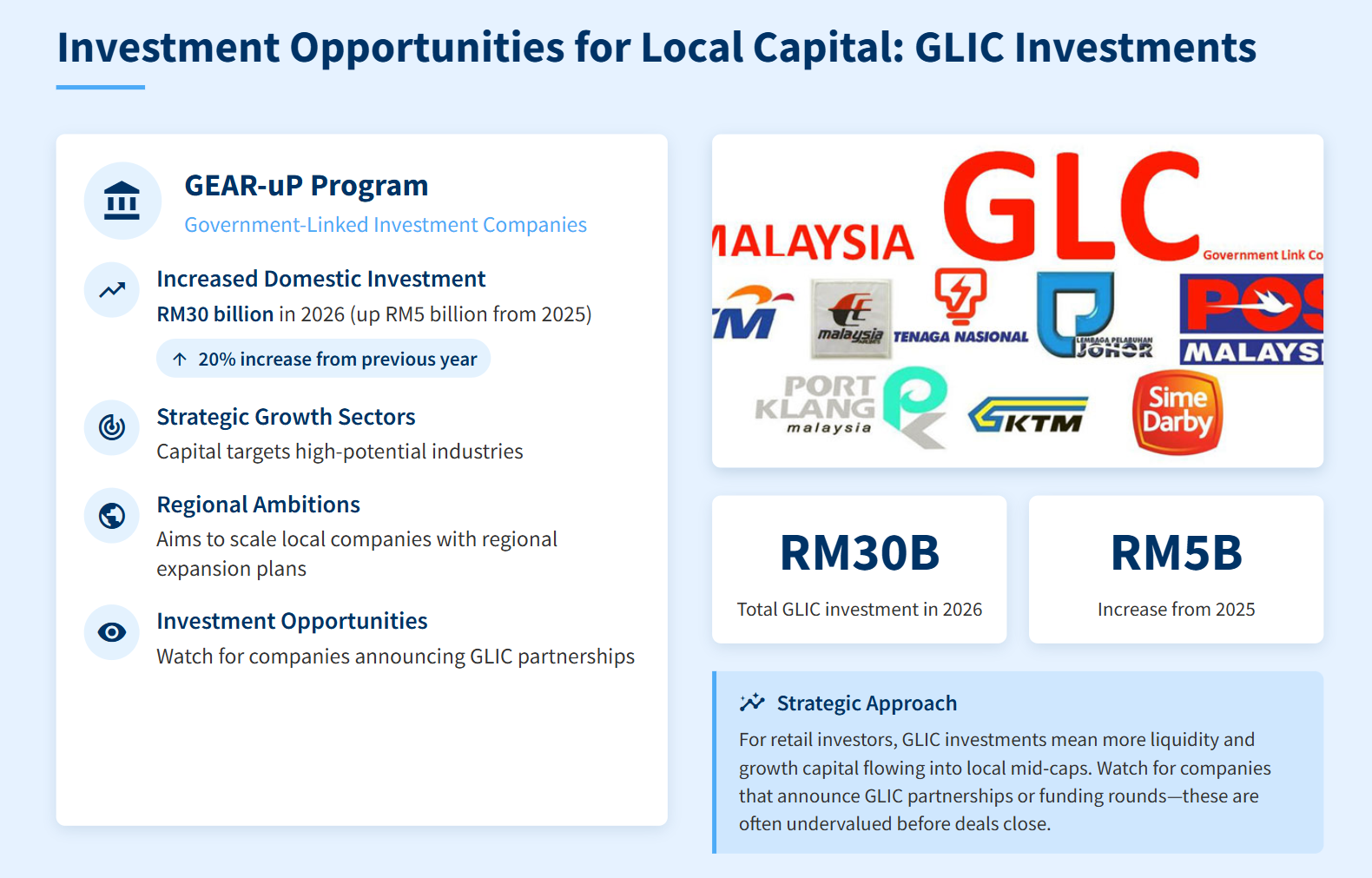 Government-Linked Investment Companies under the GEAR-uP program are increasing domestic investments to RM30 billion in 2026, up RM5 billion from 2025. This capital targets strategic growth sectors and aims to scale local companies with regional ambitions.