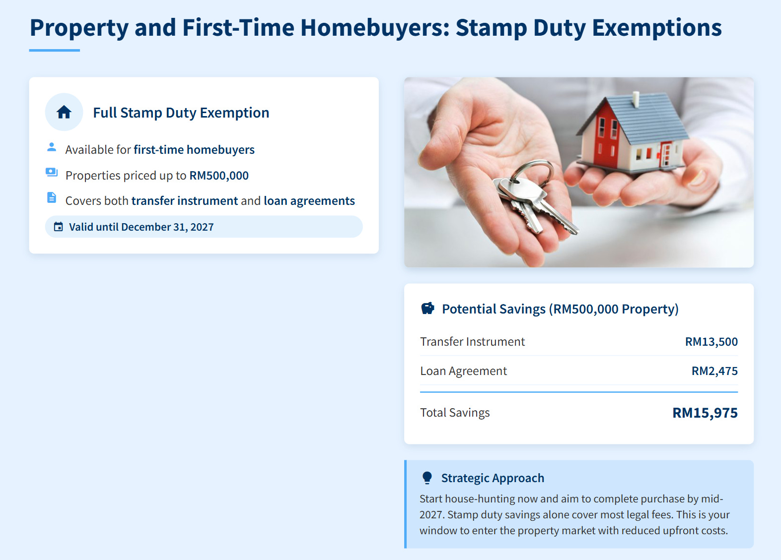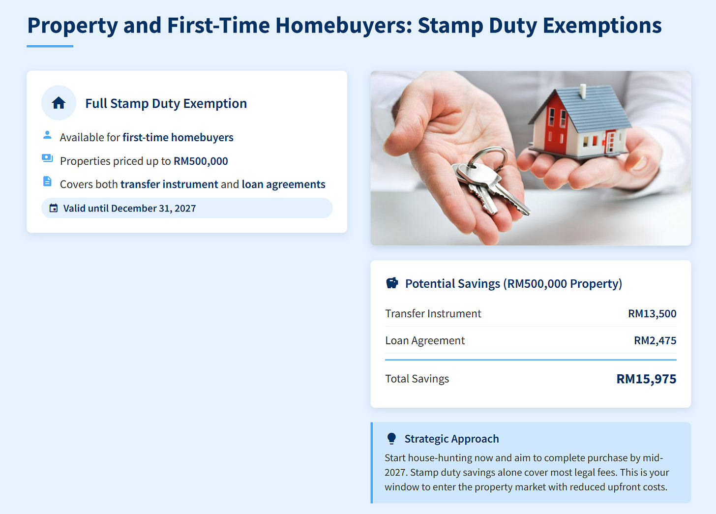 For those looking to buy their first home, this is your window. The government has extended the full stamp duty exemption for properties up to RM500,000 until the end of 2027. This is a significant direct subsidy—on a RM500,000 property, the total savings on the transfer and loan agreements are nearly RM16,000, enough to cover most of your legal fees.