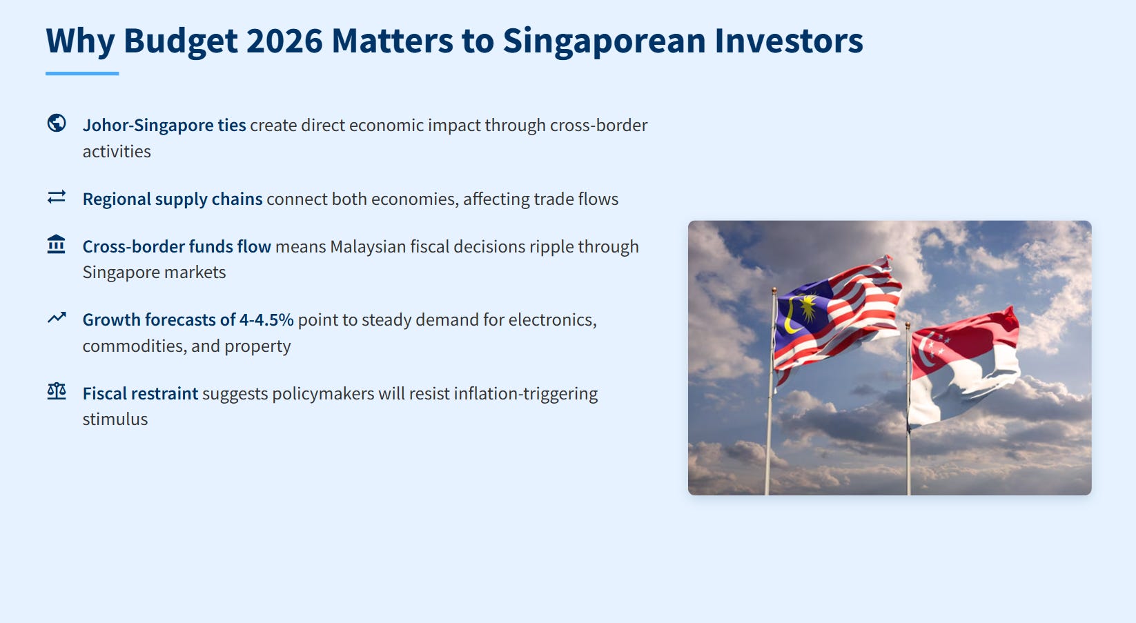This isn’t just a Malaysian domestic story. Every ringgit decision ripples directly into Singaporean portfolios. Malaysia’s 4-4.5% growth forecast is a direct demand signal for Singapore’s banks (like DBS and UOB) financing cross-border deals and our industrial S-REITs with tenants in the Johor-Singapore SEZ. At the same time, the commitment to fiscal restraint helps tame regional inflation and stabilize the MYR—a key concern for any Singaporean holding Malaysian assets or dividend stocks. This budget dictates the stability of your cross-border investments.