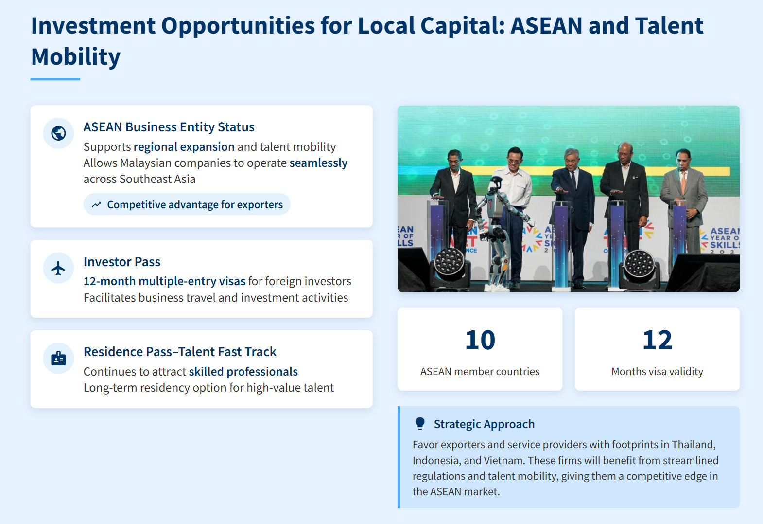 The ASEAN Business Entity status supports regional expansion and talent mobility, allowing Malaysian companies to operate seamlessly across Southeast Asia. The Investor Pass offers 12-month multiple-entry visas for foreign investors, while the Residence Pass–Talent Fast Track scheme continues to attract skilled professionals.