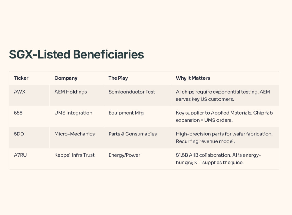 When Meta, Google, and Microsoft spend hundreds of billions on compute, the beneficiaries are the companies building the physical infrastructure. In Singapore, this filters down to the manufacturing and testing of semiconductors, and the energy required to run them.